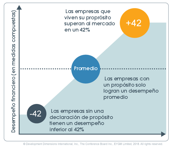 Este sentido de propósito no es solo hacer que las personas se sientan bien. Tiene enormes implicaciones en el resultado final. El Global Leadership Forecast 2018 encontró que las empresas impulsadas por un propósito superaron a otras en un 42%.